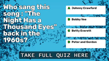 In this fun trivia quiz we're going to ask questions like "Who sang this song : "Oh, Pretty Woman" back in the 1960s?" and "Who sang this song : "The Night Has a Thousand Eyes" back in the 1960s?".