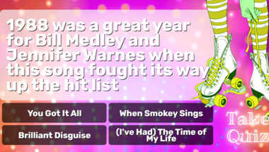 In this fun 1980s Hits quiz we're going to ask questions like "1988 was a great year for Bill Medley and Jennifer Warnes when this song fought its w.." and "The hit lists of 1986 contained this song from REO Speedwagon".