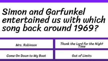 In this fun 1960s Songs quiz we're going to ask questions like "Simon and Garfunkel entertained us with which song back around 1969?" and "Simon and Garfunkel entertained us with which song back around 1967?".